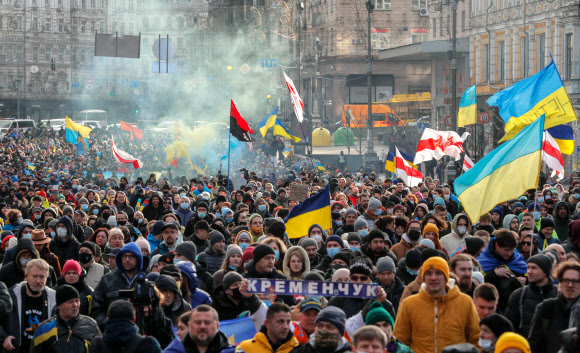 “NO푸틴” 거리로 나선 우크라 시민들 - 12일(현지시간) 우크라이나가 러시아의 침공 위험에 직면한 가운데 수도 키예프 도심에서 시민들이 국기를 휘날리며 전쟁 반대 시위를 벌이고 있다. 미국 등 주요국들이 자국민에게 우크라이나 철수를 지시하자 수천명이 거리로 뛰쳐나와 “우린 두렵지 않다. 독립을 위해 맞서 싸워야 한다”고 목청을 높이며 단결 의지를 보였다.키예프 EPA 연합뉴스 |