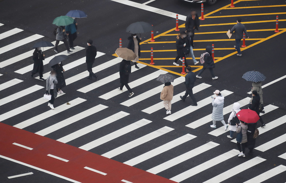 겨울비가 내린 지난해 12월 15일 서울 송파구청 앞 네거리에서 우산을 쓴 시민들이 횡단보도를 걷고 있다. 〈사진=연합뉴스〉 |