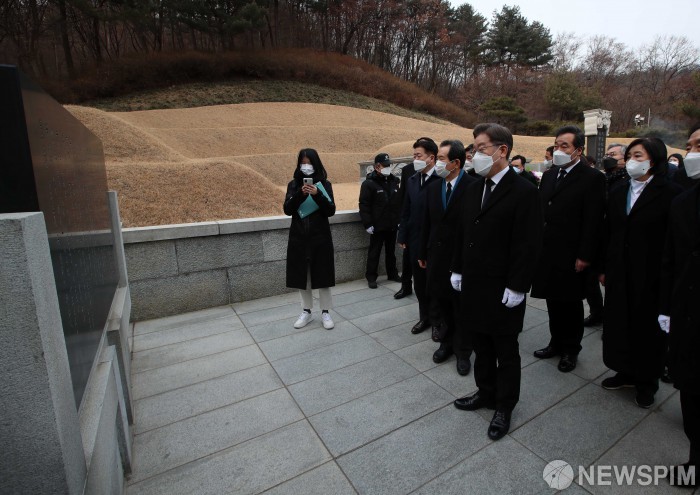 [서울=뉴스핌] 이형석 기자 = 이재명 대선후보가 14일 서울 동작동 서울현충원에서 박정희 전 대통령 묘소 참배를 한 뒤 시비를 바라보고 있다. 2022.02.14 leehs@newspim.com