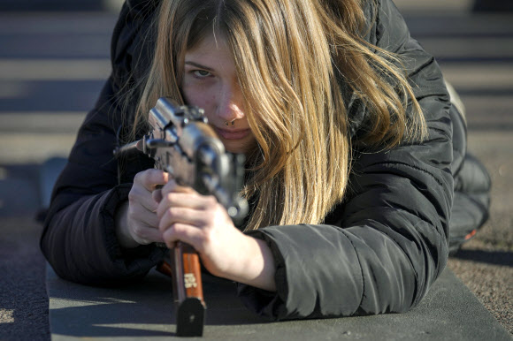 13일(현지시간) 우크라이나 동부 도네츠크주 마리우폴에서 한 여성이 우크라이나 국가방위군 산하 아조프 부대가 주관한 민간을 위한 기본 전투 훈련에 참가해 소총을 겨누고 있다. 마리우폴 AP 연합뉴스 |