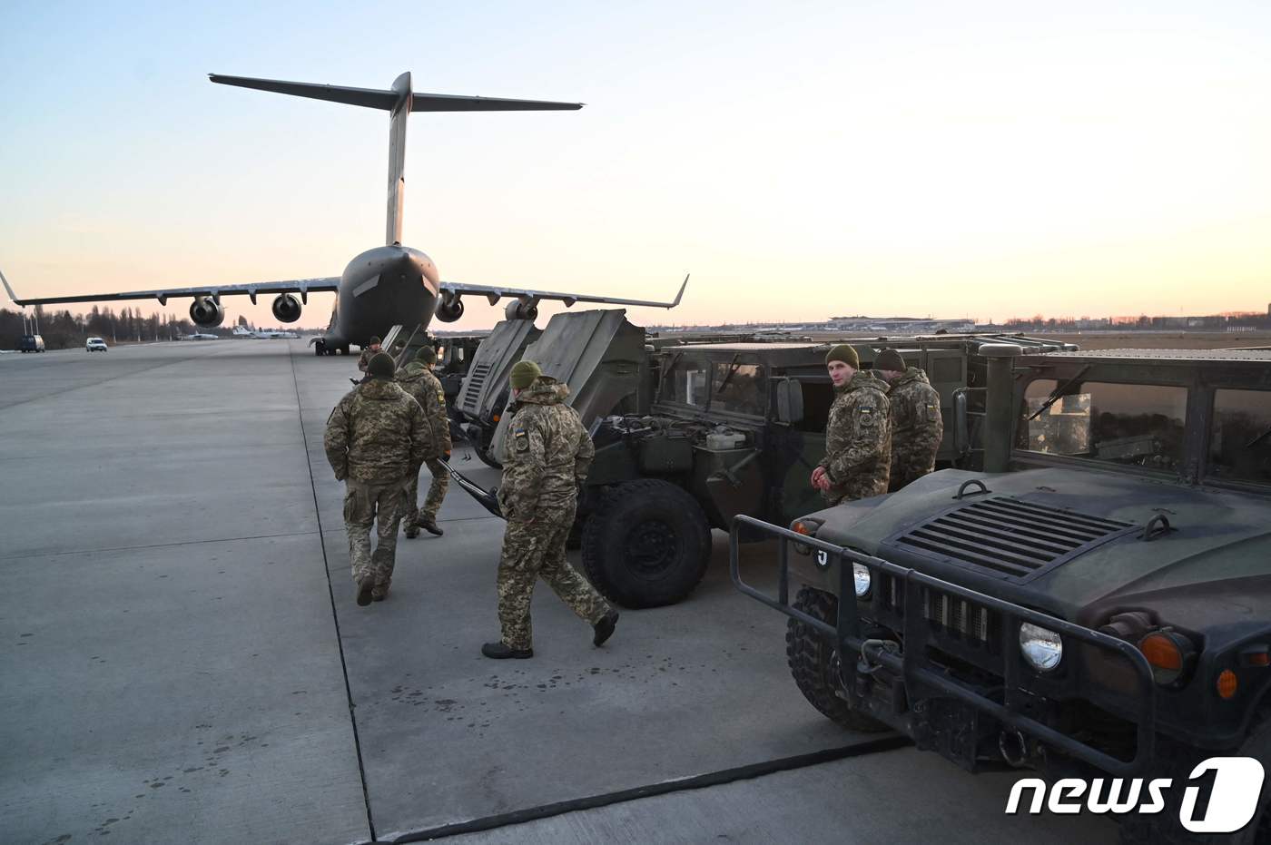 13일(현지시간) 러시아의 침공 우려 속 리투아니아서 도착한 미군 험비 차량을 우크라니아 키예프의 보리스필 공항에서 군이 점검을 하고 있다. © AFP=뉴스1 © News1 우동명 기자 |