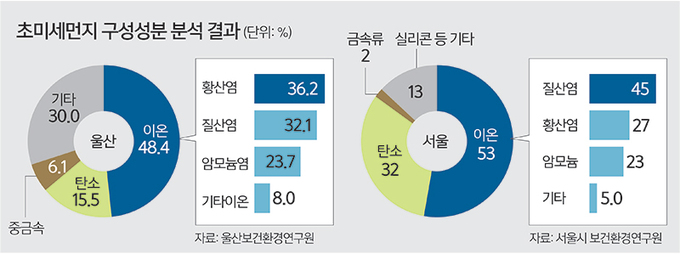 연구원이 지난 일년 동안 울산지역 초미세먼지를 분석한 결과, 황산염(SO42-), 질산염(NO3-) 등의 이온성분 8종, 유기탄소(OC) 등 탄소성분 3종, 철(Fe) 등 중금속성분 19종 등 총 30종으로 구성돼 있었다. 이 가운데 이온성분이 48.4%로 가장 많았다. 다음으로 탄소성분 15.5%, 중금속성분 6.1% 순이었다. 이온성분은 2차 생성오염물질로, 이는 직접 배출보다는 2차 생성을 유발하는 간접 배출의 기여도가 크다는 것을 의미한다고 연구원은 설명했다.