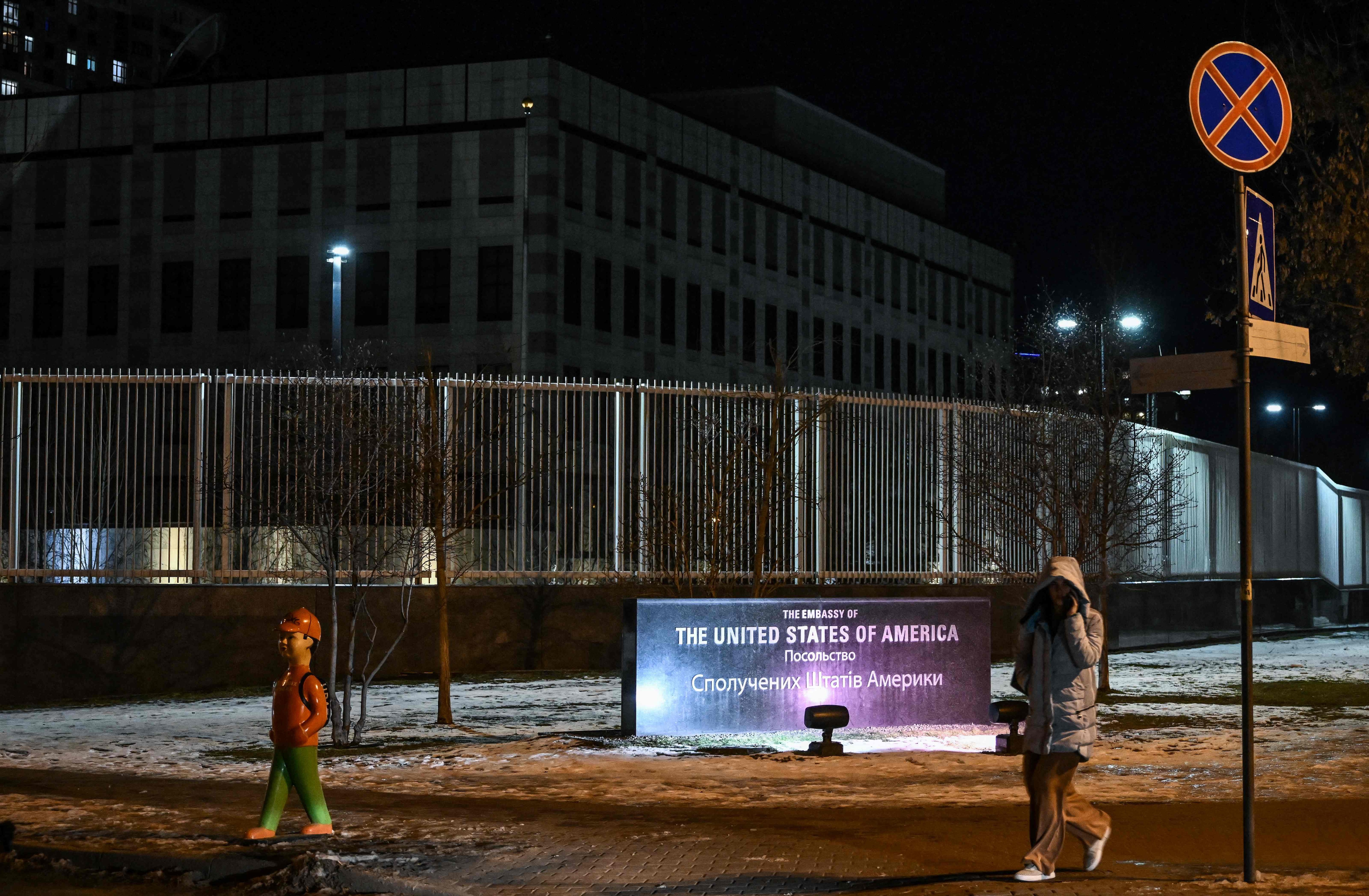 14일(현지 시각) 우크라이나 키예프의 미국대사관 앞을 한 시민이 지나가고 있다. 국무부는 이날 러시아의 병력 증강에 의한 "극적인 긴장 고조"에 따라 키예프의 주우크라이나 미국대사관을 잠시 폐쇄하고 대사관 업무를 키예프보다 서쪽에 있는 리비우로 옮겨서 보기로 했다고 밝혔다. /AFP 연합뉴스 |