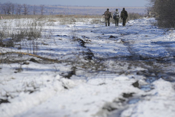 우크라이나 군인들이 14일(현지시간) 동부 루간스크 지역에서 경계 근무를 하고 있다. AP연합뉴스 |