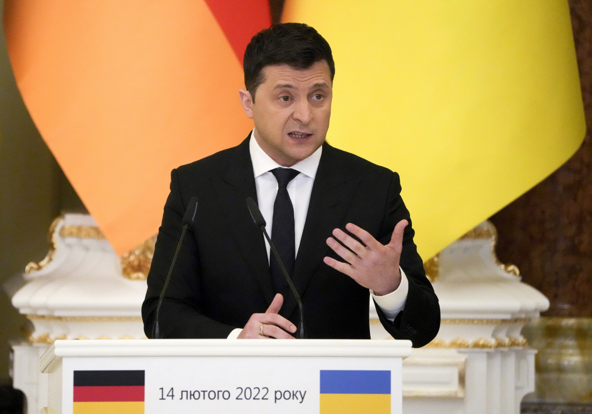 볼로디미르 젤렌스키 우크라이나 대통령이 14일(현지시간) 브리핑하고 있다. 키예프/AP뉴시스 |