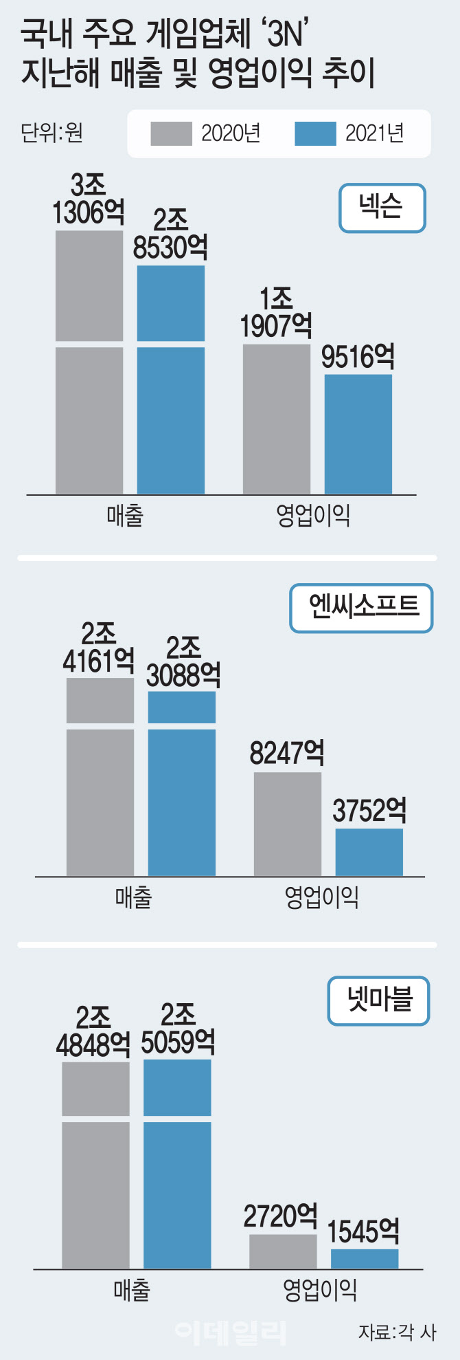 넥슨과 넷마블의 지난해 성적표도 마찬가지다. 넥슨은 지난해 매출액 2조8530억원, 영업이익 9516억원을 기록하며 전년대비 각각 6%, 18% 감소했다. 넷마블도 매출 2조5059억원은 0.8% 늘었지만, 영업이익이 1545억원으로 43.2% 줄었다. 2020년 사상 처음으로 3N 연간 매출 8조원 시대를 연 이후 외형 성장이 주춤한 모양새다.