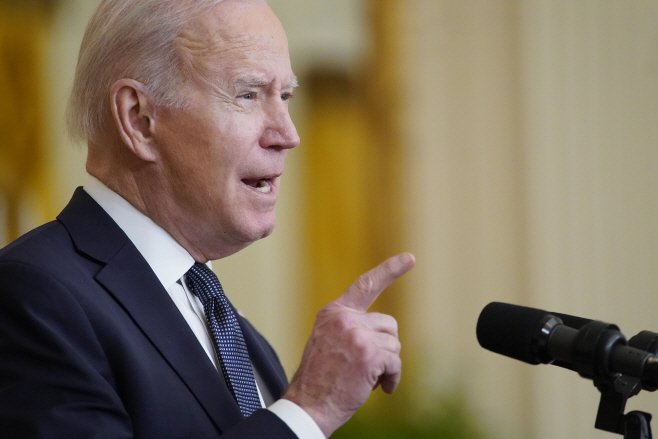 조 바이든 미국 대통령이 15일(현지시간) 백악관 이스트룸에서 러시아의 우크라이나 침공 가능성에 관해 대국민연설을 하고 있다./사진=워싱턴 D.C. AP=연합뉴스 |