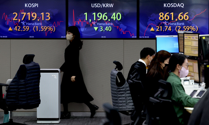 16일 유가증권시장에서 코스피는 전날보다 53.14포인트(1.99%) 오른 2729.68에 마감했다. 최근 급락했던 코스닥도 38.23포인트(4.55%) 오른 878.15을 나타냈다. 지정학적 위험이 누그러지면서 위험자산 선호현상이 나타난 결과다. 이날 서울 외환시장에서 원·달러 환율은 전날보다 2.2원 내린 1197.6에 마감했다.