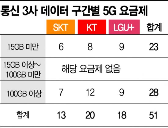 16일 국회 과학기술정보방송통신위원회 소속 김상희 더불어민주당 의원이 과학기술정보통신부에 요청한 자료에 따르면 통신 3사를 합쳐 현재 가입 가능한 5G 요금제 중 15GB 이상~100GB 미만 데이터 구간 요금제는 0개다. 전체 51종 요금제 중 단 하나도 없는 셈이다. 요금제 구간별로 보면 15GB 미만이 23종, 무제한 포함 100GB 이상이 28종으로 양극화 현상이 뚜렷하다. 무제한 요금제는 18종으로 전체 35%를 차지한다. 15GB 미만 요금제 역시 작년 10월 이후 온라인 전용 요금제가 출시되면서 다소 늘었지만 데이터 제공량이 2~12GB에 그쳐 실수요가 적다는 평가다. 어린이나 청소년, 장애인 등 제약 조건이 달린 상품도 많다.
