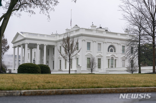[워싱턴=AP/뉴시스]18일(현지시간) 미국 워싱턴의 백악관에 '애틀랜타 총격' 희생자를 애도하는 조기가 걸려 있다. 조 바이든 대통령은 16일 발생한 애틀랜타 총격 피해자들에 대한 애도와 존경의 표시로 조기게양을 명령해 오는 22일 일몰 때까지 백악관을 비롯한 미전역과 영토에서 조기를 게양한다. 2021.03.19. |