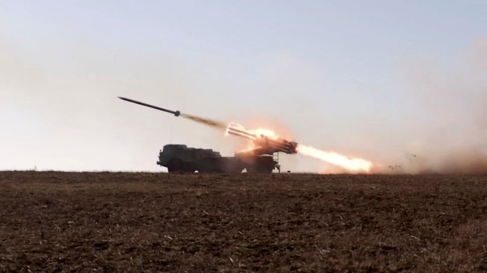 15일(현지시간) 크림반도의 오푸크 러시아군 훈련장에서 러시아군의 자체 추진 방사포 시스템인 우라간에서 로켓이 발사되고 있다. 로이터연합뉴스 |