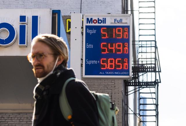 10일 미국 뉴욕에서 한 시민이 주유소 앞을 지나고 있다. 러시아의 우크라이나 침공 우려가 커지면서 국제유가는 수 주째 배럴당 90달러를 웃돌고 있다. 뉴욕=EPA 연합뉴스 |