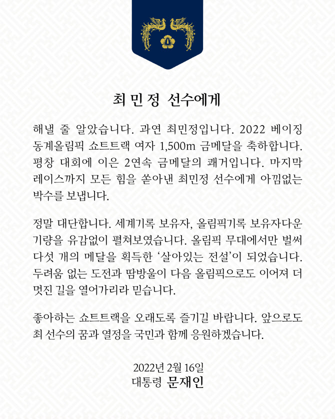 문 대통령은 아울러 “좋아하는 쇼트트랙을 오래도록 즐기길 바란다”며 “앞으로도 최 선수의 꿈과 열정을 국민과 함께 응원하겠다”고 했다.