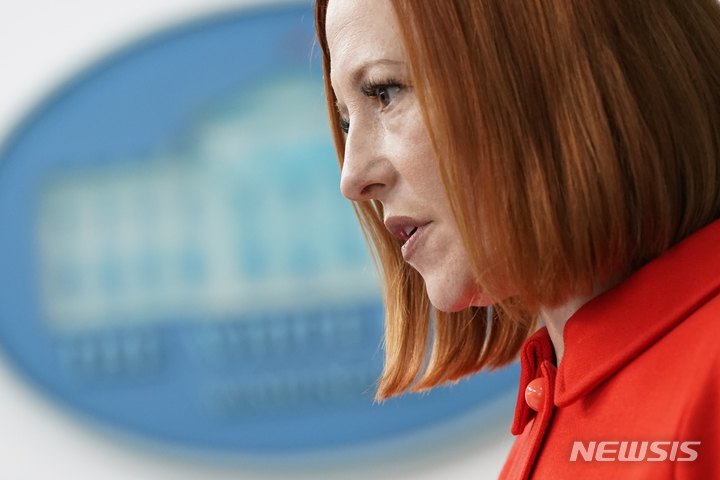 [워싱턴=AP/뉴시스]젠 사키 백악관 대변인이 16일(현지시간) 정례브리핑을 하고 있다. 2022.02.16. |