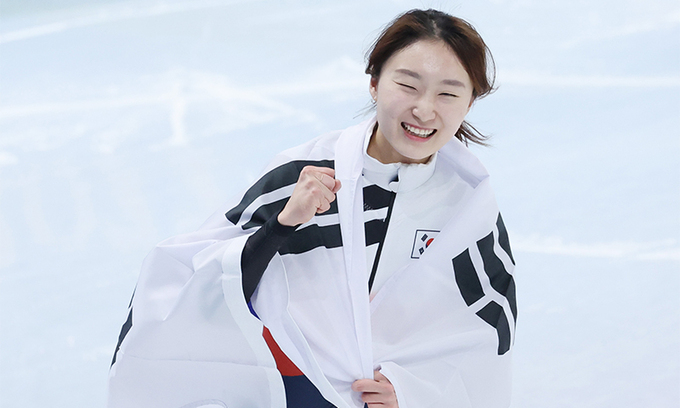 최민정이 지난 16일 중국 베이징 캐피털 실내 경기장에서 열린 2022 베이징 동계올림픽 쇼트트랙 여자 1500m 결승에서 금메달을 확정 지은 뒤 기뻐하고 있다. 연합뉴스 |