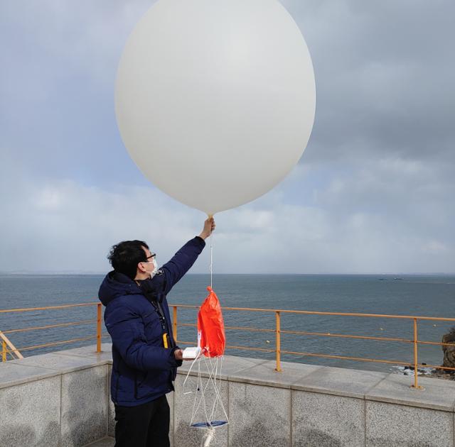 서해안 20㎞ 상공의 미세먼지 관측을 위해 헬륨풍선을 띠우고 있다. 충남도 제공 |