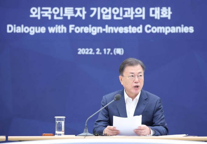 [서울=뉴시스] 전진환 기자 = 문재인 대통령이 17일 오전 청와대 영빈관에서 열린 외국인투자기업인과의 대화에 참석, 발언하고 있다. 2022.02.17. |