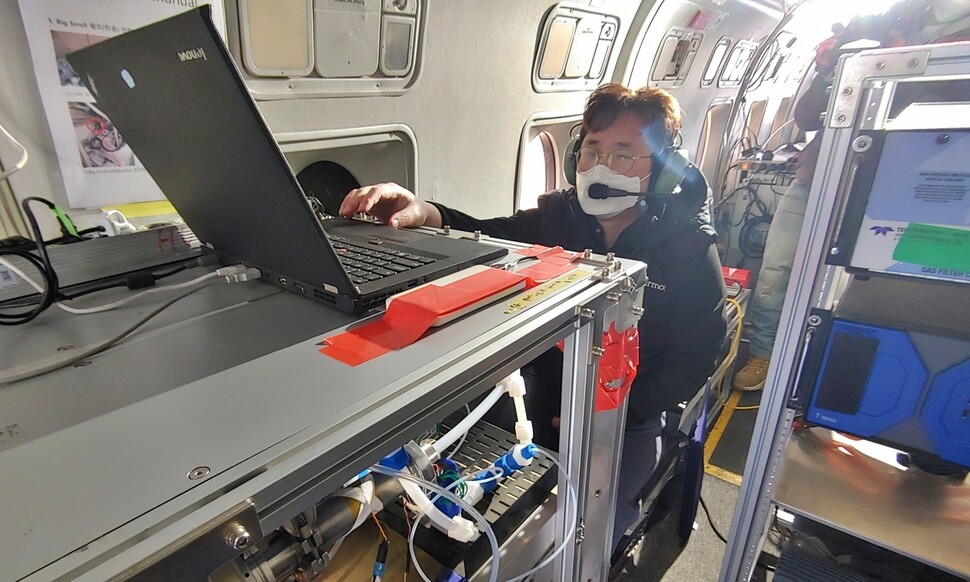 서범근 한서대 환경연구소 교수가 17일 대기질 관측 항공기인 ‘한서대 1900D’에 탑승해 서해안 상공의 미세먼지를 측정하고 있다. 충남도 제공 |