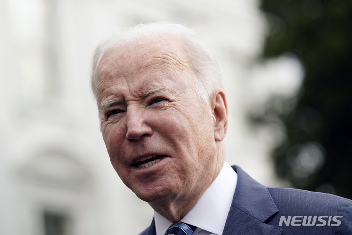 [워싱턴=AP/뉴시스]조 바이든 미국 대통령이 17일(현지시간) 백악관 사우스론에서 전용기 탑승 전 기자들과 대화하고 있다. 2022.02.17. |