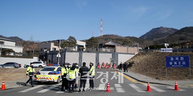 대구 달성군 유가읍 쌍계리에 있는 박근혜 전 대통령의 사저로 확인된 건물 입구에 경찰관들이 근무 중이다. |