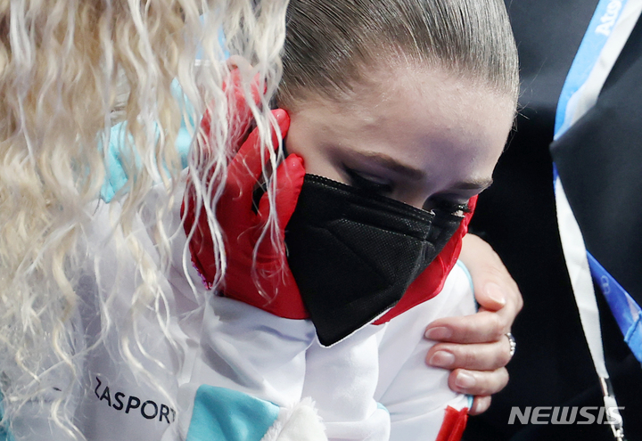 [베이징(중국)=뉴시스] 고범준 기자 = 17일 오후 중국 베이징 캐피털 실내경기장에서 열린 2022 베이징동계올림픽 피겨 스케이팅 여자 싱글 프리스케이팅에서 금지약물(도핑) 적발에도 불구하고 출전한 러시아올림픽위원회(ROC) 카밀라 발리예바가 연기를 마치고 4위르 성적을 받고 눈물을 흘리고 있다. 2022.02.17. bjko@newsis.com |