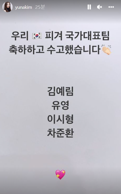 김연아는 18일 자신의 인스타그램 스토리에 "우리 피겨 국가대표팀 축하하고 수고했다"며 김예림, 유영, 이시형, 차준환 등의 이름을 나열했다.
