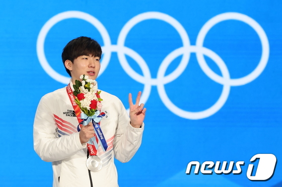 (베이징=뉴스1) 안은나 기자 = 정재원이 19일 오후 중국 베이징 메달플라자에서 열린 2022 베이징 동계올림픽 스피드스케이팅 남자 매스스타트 메달수여식에서 은메달을 목에 걸고 기뻐하고 있다. 2022.2.19/뉴스1