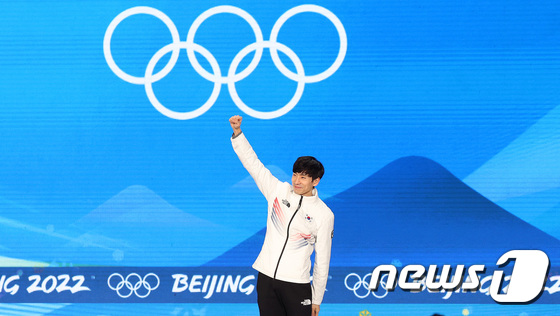 (베이징=뉴스1) 박지혜 기자 = 2022 베이징 동계올림픽 스피드스케이팅 남자 매스스타트에서 동메달을 획득한 이승훈이19일 오후 중국 베이징 메달 플라자에서 열린 메달 수여식에서 단상에 오르며 주먹을 뻗고 있다. 2022.2.19/뉴스1