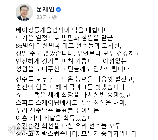 문 대통령은 이날 사회관계망서비스(SNS)에 올린 글에서 “뜨거운 열정으로 빙판과 설원을 달군 65명의 대한민국 대표 선수들과 코치진, 정말 수고 많았다. 무엇보다 모두 건강하고 안전하게 경기를 마쳐 기쁘다”며 이같이 말했다.