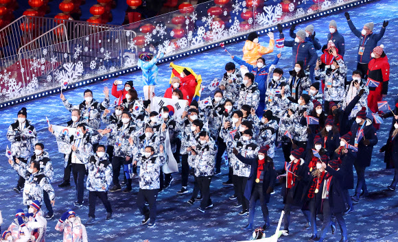 [올림픽] 폐회식 입장하는 대한민국 선수단 - 20일 중국 베이징 국립경기장에서 열린 2022 베이징 동계올림픽 폐회식에서 대한민국 선수단이 입장하고 있다. 2022.2.20 연합뉴스 |