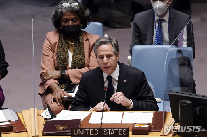 [뉴욕=AP/뉴시스] 앤서니 블링컨 미국 국무장관이 17일(현지시간) 미국 뉴욕의 유엔본부에서 열린 유엔 안전보장이사회에 참석해 우크라이나 상황과 관련해 발언하고 있다. 블링컨 장관은 "러시아는 우크라이나를 침공하지 않을 것이라고 분명하게 선언할 수 있다”라며 불가침 선언을 촉구했다. 2022.02.18. |