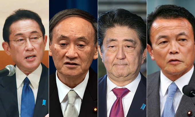 기시다 총리(왼쪽부터), 스가 전 총리, 아베 전 총리, 아소 부총재 |