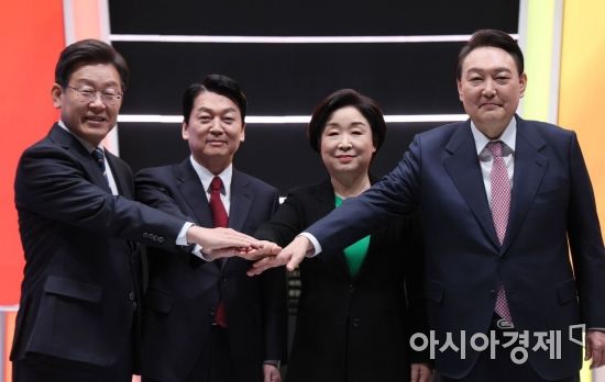 이재명 더불어민주당·안철수 국민의당·심상정 정의당·윤석열 국민의힘 등 여야 대선 후보가 21일 서울 마포구 MBC에서 열린 중앙선거관리위원회 주관 첫 토론회에 앞서 포즈를 취하고 있다./국회사진기자단 |