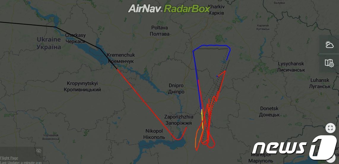 미국 공군의 고고도 무인정찰기 글로벌 호크가 23일(현지시간) 우크라이나 상공을 날며 정찰하고 있는 모습이 '플라이트레이더24', '레이더 박스'등 민간기업들의 레이더망에 포착됐다.