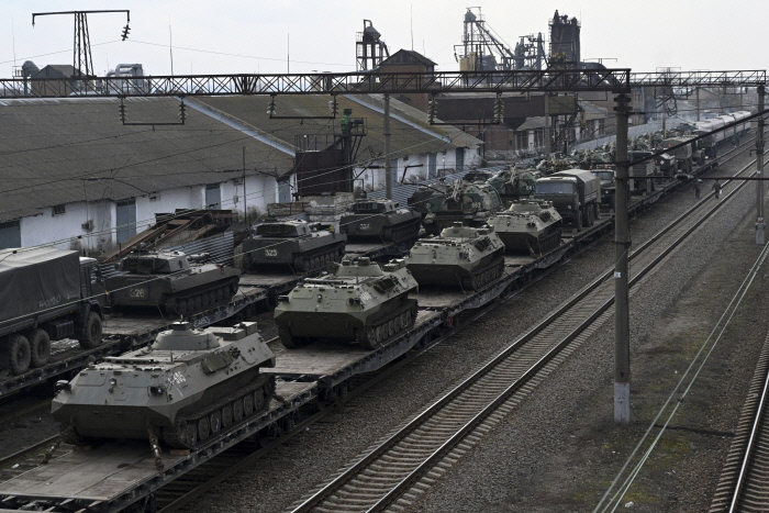 우크라이나를 둘러싼 전운이 고조되고 있는 가운데 23일(현지시간) 국경을 맞댄 러시아 로스토프온돈 인근 철도역의 열차 위에 장갑차가 즐비하게 실려 있다. 러시아는 우크라이나 동부 돈바스 지역에 평화유지 명목으로 군대를 파견하기로 한 뒤 접경지역에서 병력을 증강하고 있다. AP=연합뉴스 |