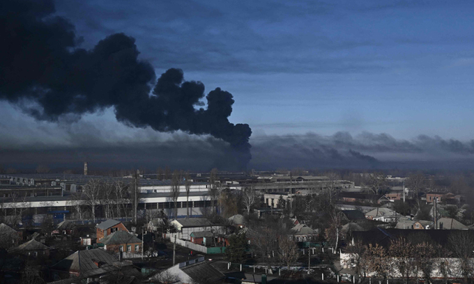 24일(현지시간) 러시아와 인접한 우크라이나 동부 하르키우 지역 추구예프 군공항에서 검은 연기가 피어오르고 있다. AFP연합뉴스 |