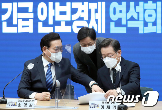 (서울=뉴스1) 이승배 기자 = 이재명 더불어민주당 대선후보와 송영길 상임선대위원장이 24일 오후 서울 여의도 당사에서 열린 긴급 안보경제 연석회의에서 회의 자료를 보며 논의하고 있다. 2022.2.24/뉴스1