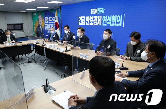 (서울=뉴스1) 이승배 기자 = 이재명 더불어민주당 대선 후보가 24일 오후 서울 여의도 당사에서 열린 긴급 안보경제 연석회의에서 모두발언을 하고 있다. 2022.2.24/뉴스1