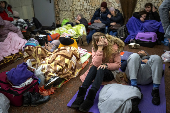러시아군 포격 피해 지하철서 잠 청하는 우크라이나인들. 키예프=AP연합 |