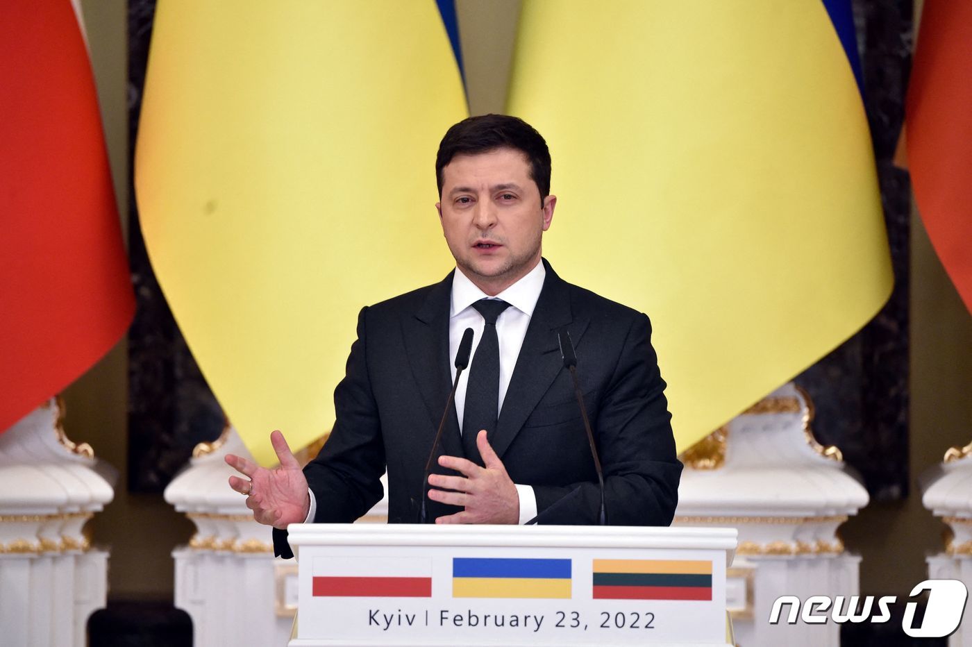 볼로디미르 젤렌스키 우크라이나 대통령이 23일 (현지시간) 키예프에서 안제이 두다 폴란드 대통령, 기타나스 나우세다 리투아니아 대통령과 기자회견서 “유럽 안보의 미래가 우크라이나에서 결정되고 있다”고 밝히고 있다. © AFP=뉴스1 © News1 우동명 기자 |