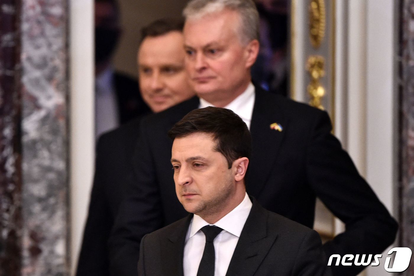 볼로디미르 젤렌스키 우크라이나 대통령이 23일 (현지시간) 키예프에서 안제이 두다 폴란드 대통령, 기타나스 나우세다 리투아니아 대통령과 기자회견에 도착을 하고 있다. © AFP=뉴스1 © News1 우동명 기자 |