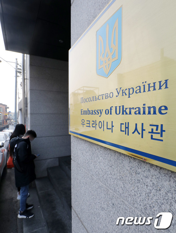 (서울=뉴스1) 박세연 기자 = 25일 우크라이나인들이 본국에 있는 가족들의 안부를 묻기위해 서울 용산구 주한 우크라이나대사관을 찾아 기다리고 있다.