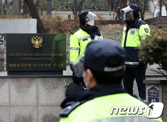 (서울=뉴스1) 박세연 기자 = 25일 서울 중구 정동 주한 러시아대사관앞에서 경찰병력이 경비를 서고 있다.
