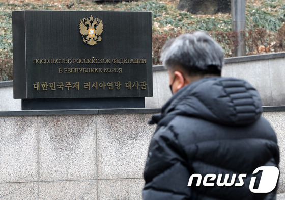 (서울=뉴스1) 박세연 기자 = 25일 서울 중구 정동 주한 러시아대사관 앞으로 한 시민이 지나가고 있다.