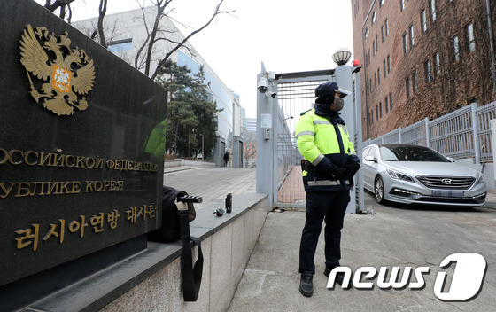 (서울=뉴스1) 박세연 기자 = 25일 서울 중구 정동 주한 러시아대사관으로 차량이 들어서고 있다.