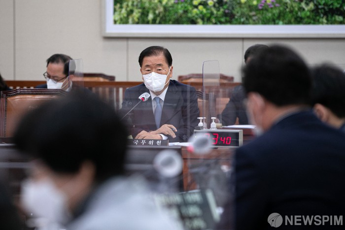 [서울=뉴스핌] 이형석 기자 = 정의용 외교부 장관이 25일 오후 서울 여의도 국회에서 열린 러시아-우크라이나 사태 관련 국회 외교통일위원회 전체회의에서 현안 질의답변을 하고 있다. 2022.02.25 leehs@newspim.com