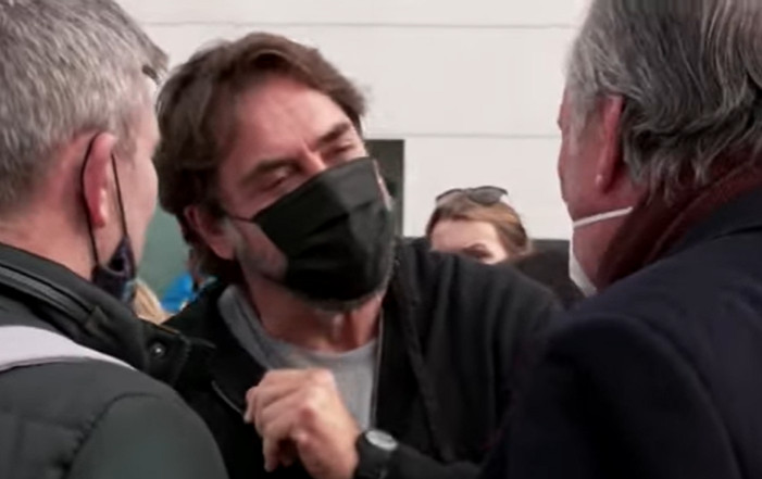 배우 하비에르 바르뎀(가운데)이 스페인 러시아 대사관 앞에서 열린 시위에 참석했다. 사진| 유튜브 캡처 |