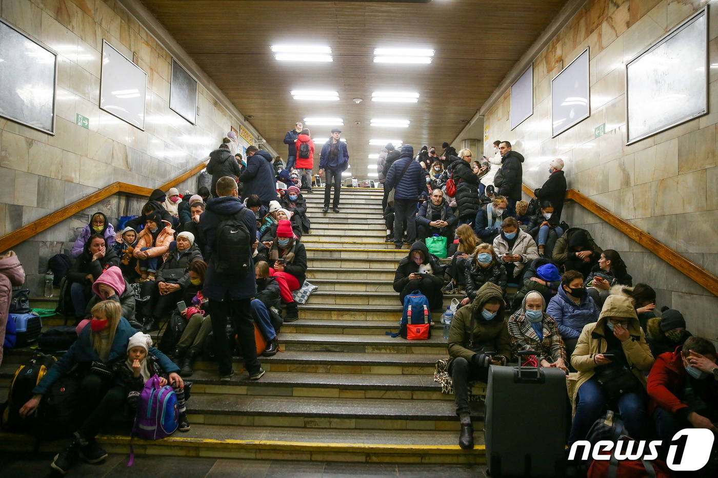 2022년 2월 24일(현지시간) 우크라이나 시민들이 공습 경보에 지하철역으로 대피해 있다. |
