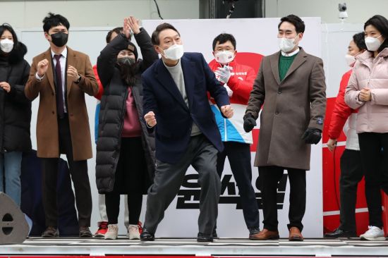 윤석열 국민의힘 대선후보가 26일 오후 서울 구로구 홈플러스 신도림점 앞에서 열린 "구로를 디지털 굳로(Good road)로, 윤석열과 함께" 유세에서 어퍼컷 세리머니를 하고 있다. (사진 제공=연합뉴스) |