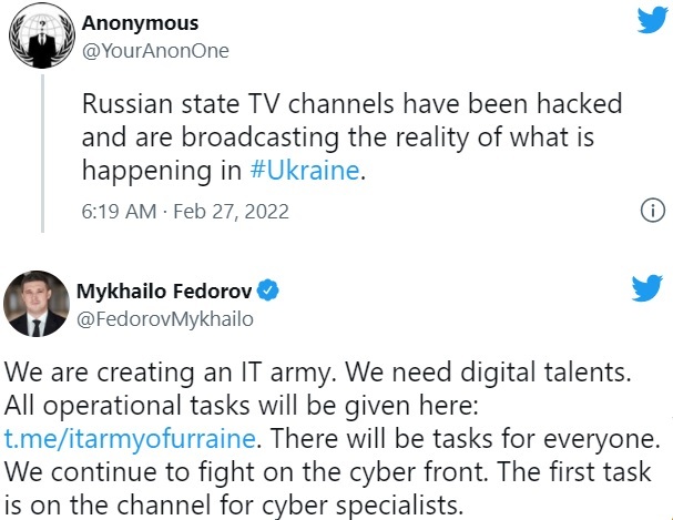 미카일로 페도로프 우크라이나 부총리 겸 디지털 트랜스포메이션 장관은 트위터를 통해 "우리는 IT군(IT army)을 조직 중"이라면서 "디지털 인재들이 필요하다"고 밝혔다. 그러면서 러시아를 상대로 사이버전을 계속할 것이라고 밝혔다.